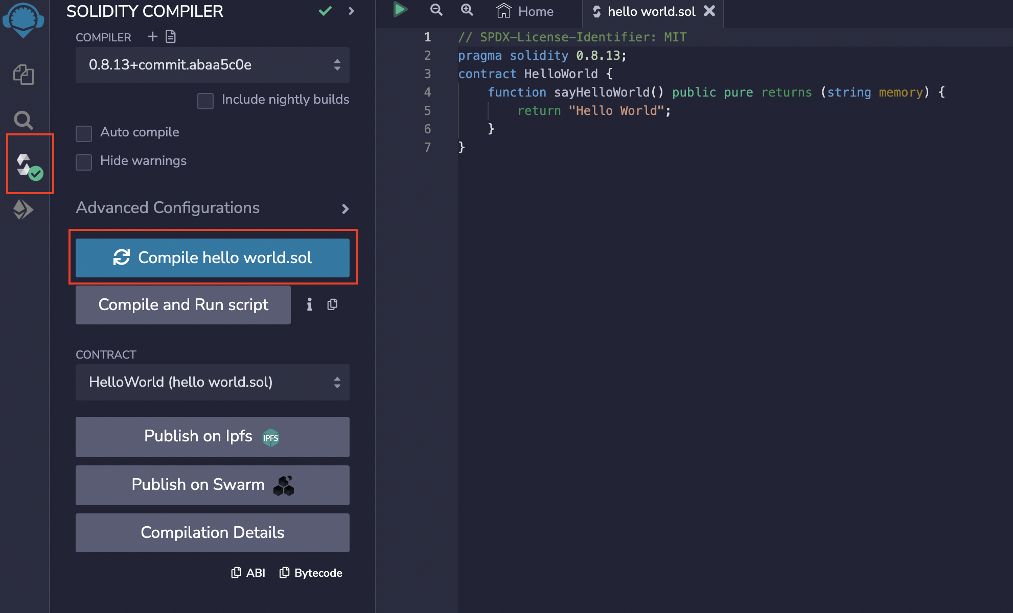 The contract ABI and Bytecode are available on the Solidity compiler tab.